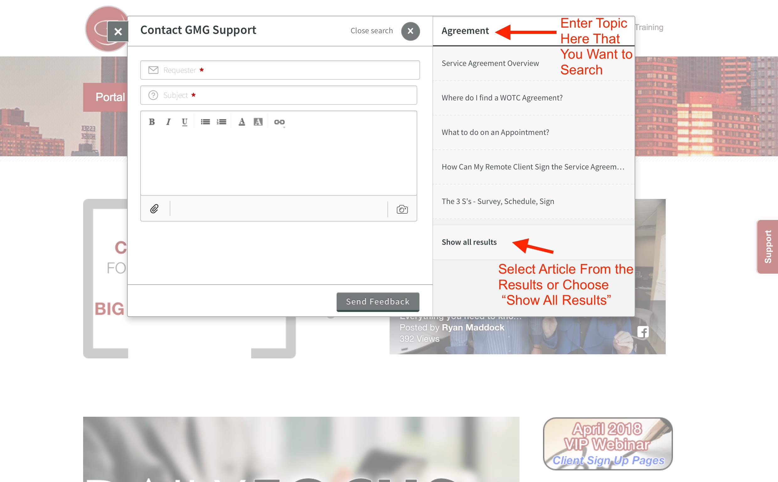 From there, you may type in the topic of what you are looking for and either select the article or select "show all results" to view all articles. We do suggest sticking to key words such as "Discovery Call" or "Agreement" as this will populate the most options in articles to help you find what you are looking for.